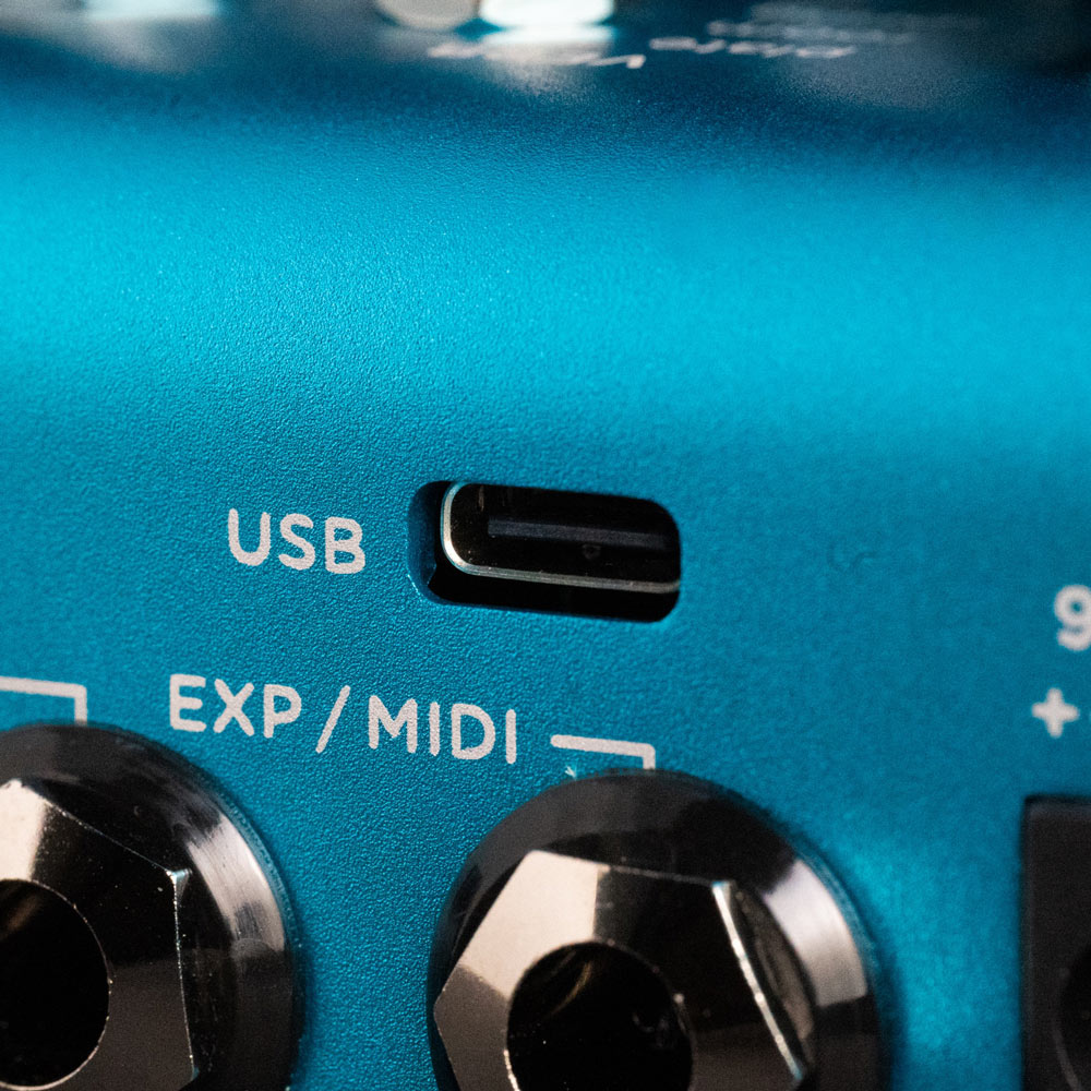 新世代blueSkyはMIDI機能をフル装備しています。EXP/MIDIジャックまたはUSB-C経由で、外部のMIDIコントローラーやDAWからMIDIコマンドを受けて、ほぼすべてのスイッチ、ノブ、設定をリモートでフルコントロールできます。クロック同期、および同期設定はプリセットごとに保存できます。300のプリセットが保存でき、お気に入りの設定をロードしてすぐに使えます。リモートでペダルをバイパスまたはONにしたり、DECAYなどノブの設定を自動化してセットリストごとにプリセットを呼び出すなど、MIDIの可能性は無限大です。