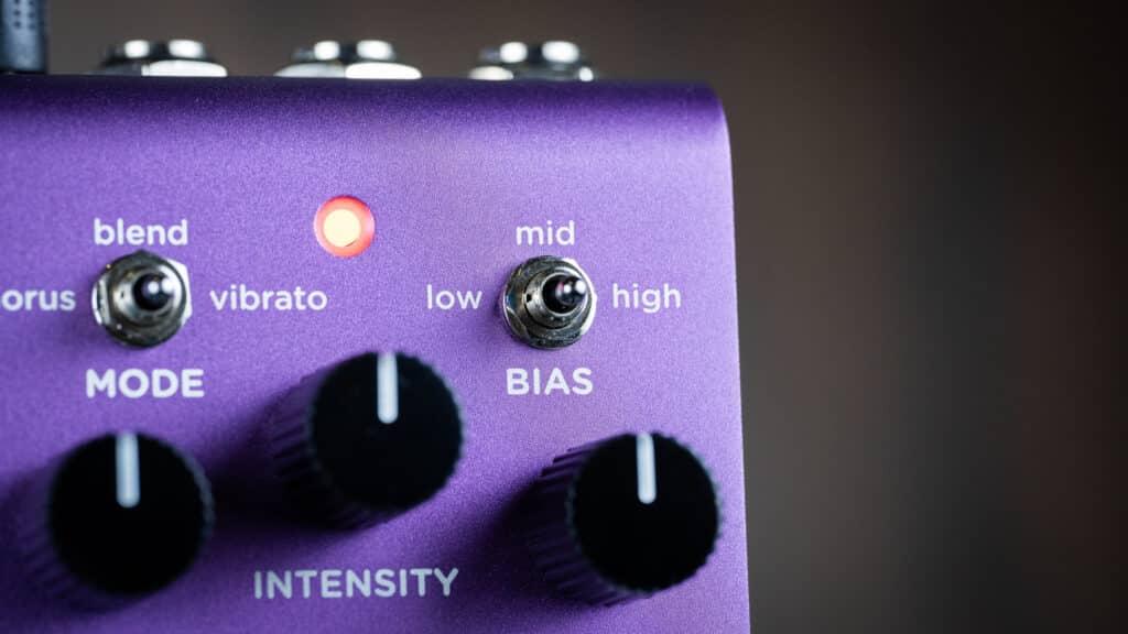 UltraVioletのモードスイッチは、ウェット信号とドライ信号の異なるミックス比を決定します。Chorusモードでは50/50ミックスで、最も深くねばりながら吹き出すバイブトーンを実現します。Intensityをミッドポイントからマックスに、Speedを中間に設定すると定番のクラシックなバイブトーンが再現できます。
